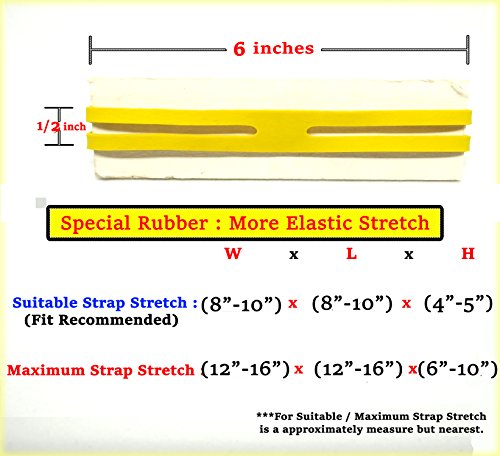 This Special Rubber normal size 6 inches long and 1/2 inches wide: Suitable Strap Strength (W x L x H) 10” x 10” x 5” and Maximum Strap Strength 16” x 16” x 10”