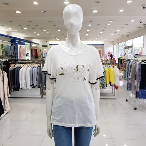 가슴 비즈 꽃장식 프릴소매 라운드 면티셔츠-CB7U6-WKS830-110화이트