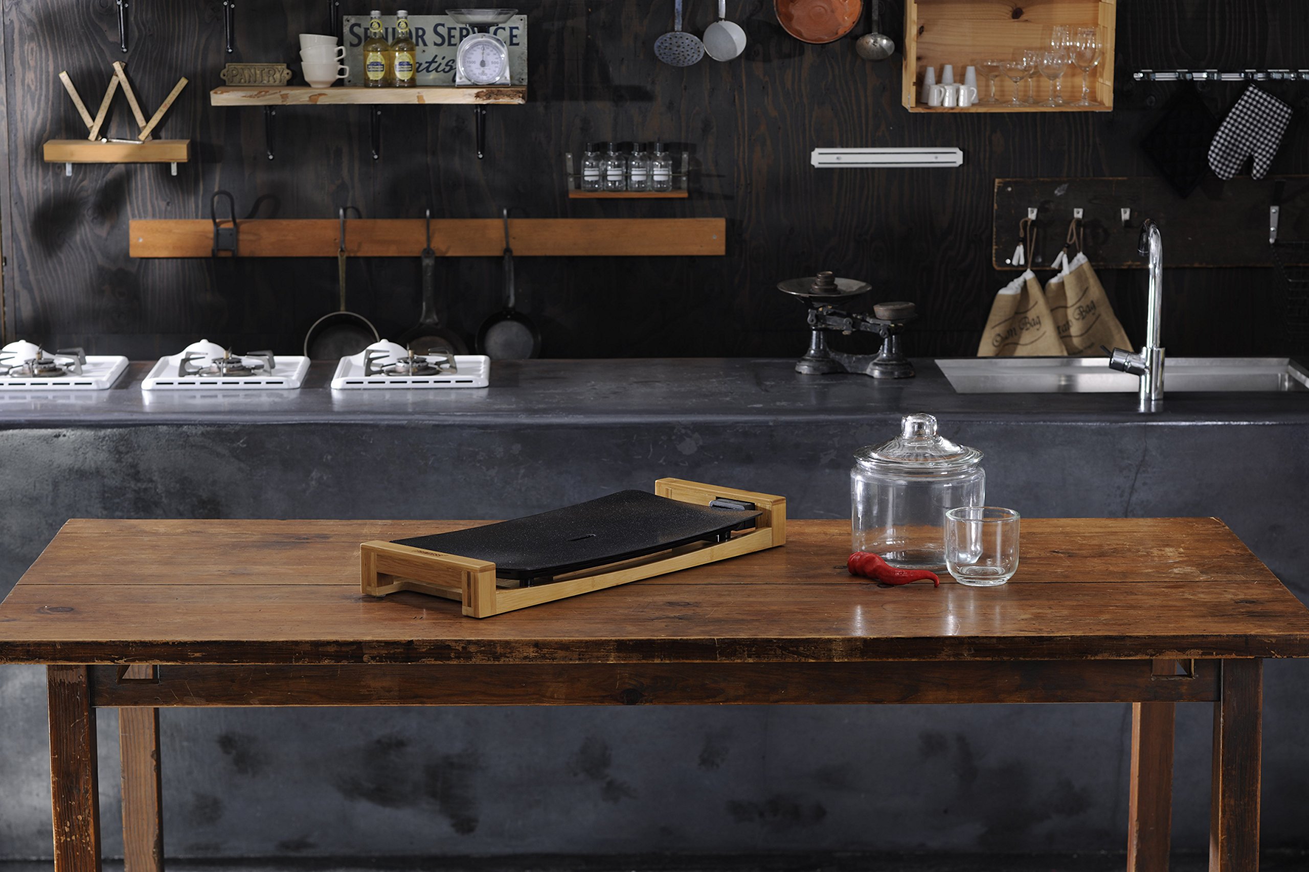 ● Grill plate with ceramic casting on aluminum casting on bamboo material pedestal.