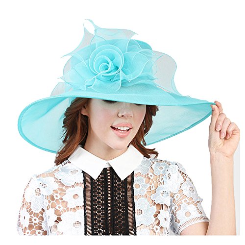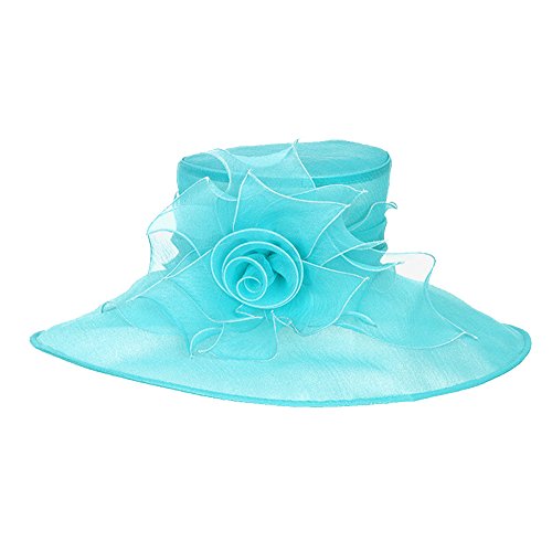 Product Description? Color : Blue Zircon ? Theme : Flower Leaf ? Crown circumference : 23" ? Crown Height : 4" ? Brim Width : 6" ? Material : 100% Polyester ? Flower detail organza hat0