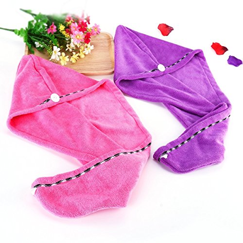 Hair Drying Towels, COSCOD 2 Pack Quick Dry Ultra Absorbent Microfiber Hair Towel Turban Wrap Shower Head Towel for Long Hair Women with Buttons
