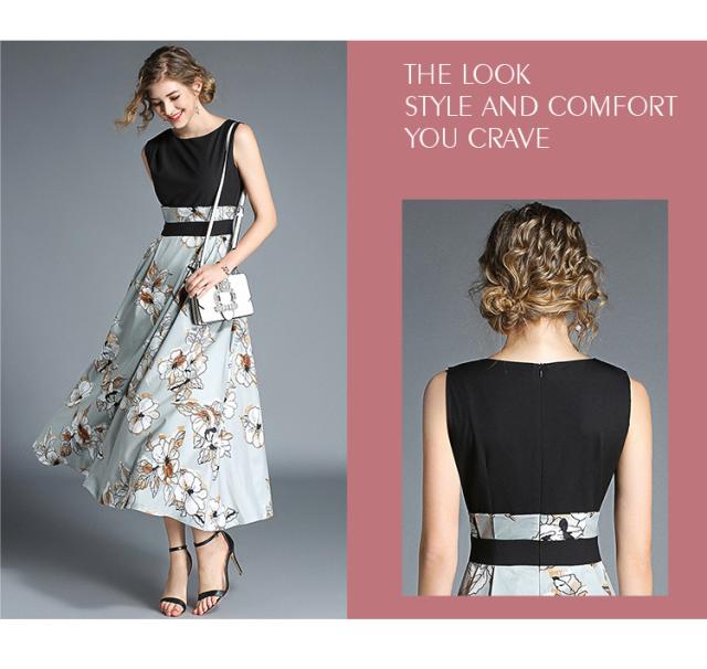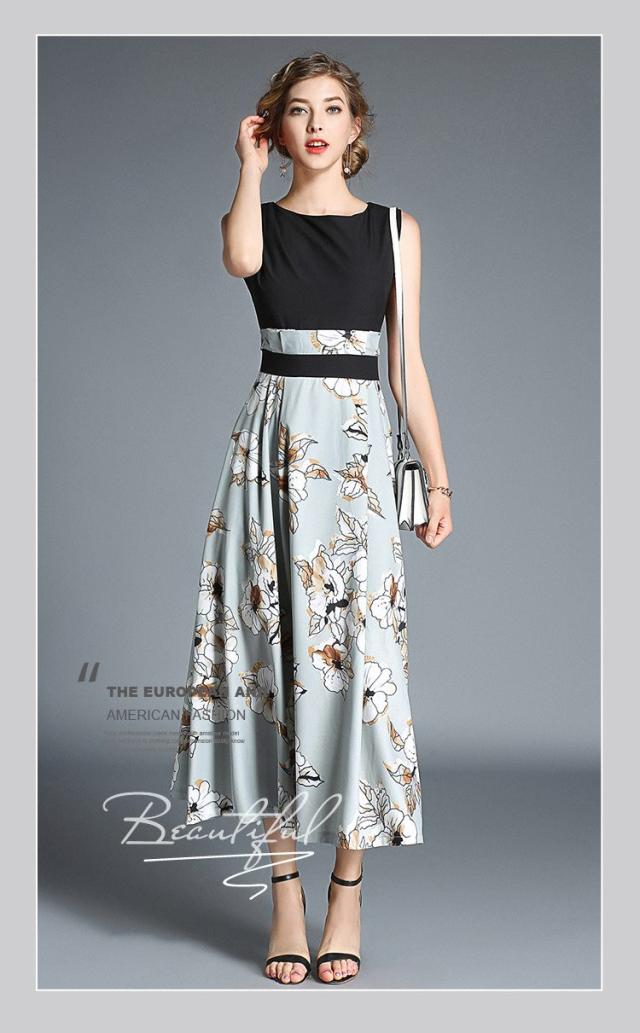 花柄 プリント ノースリーブ マキシ丈 ロング ワンピース 結婚式 二次会 披露宴 パーティー ランチ 女子会 デート 通勤 秋 夏 オフィス 着痩せ ヨーロッパ風