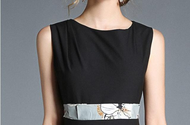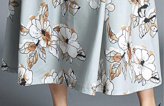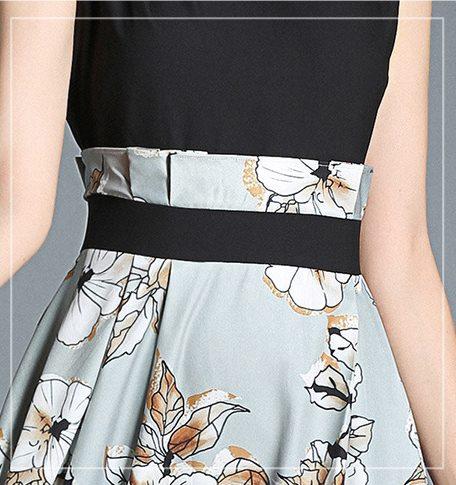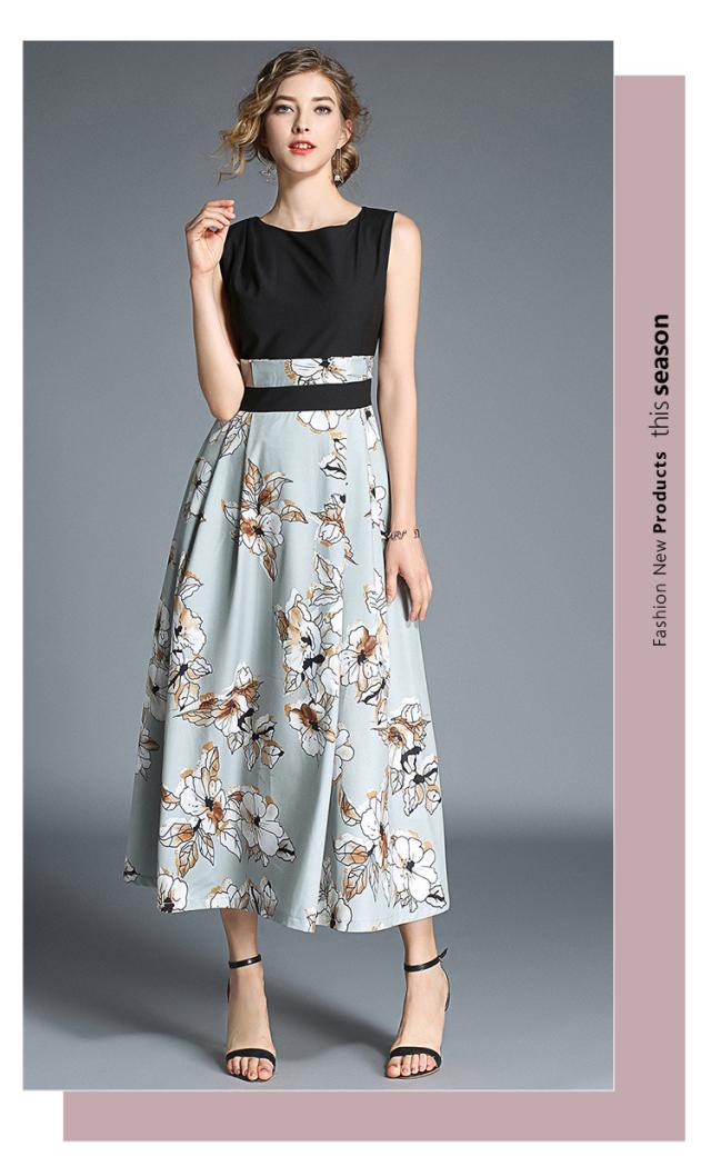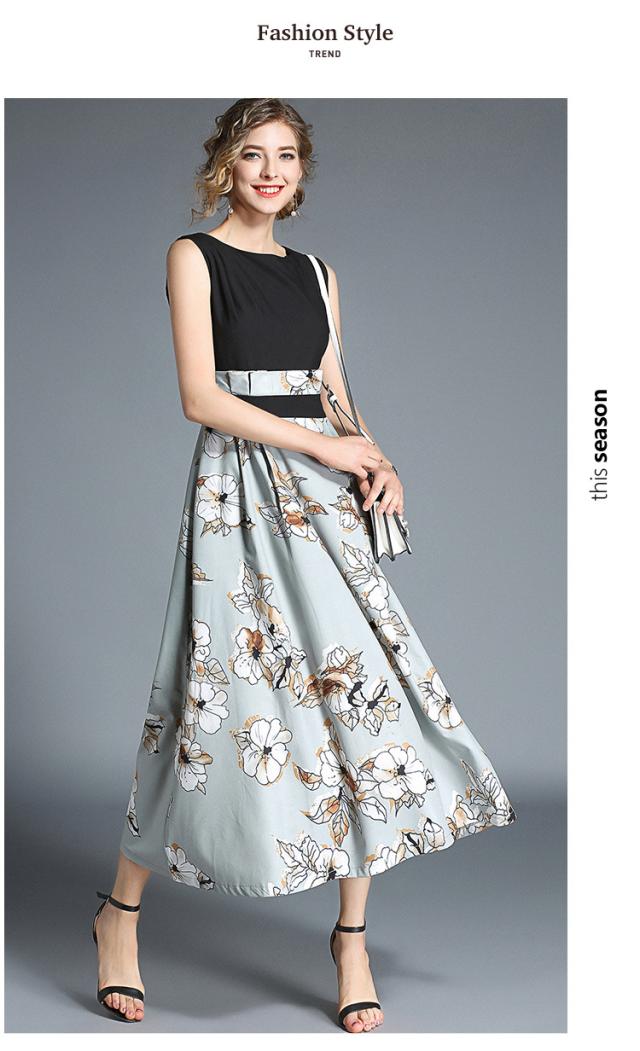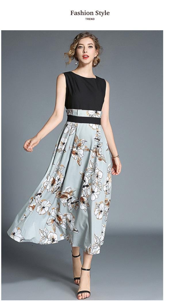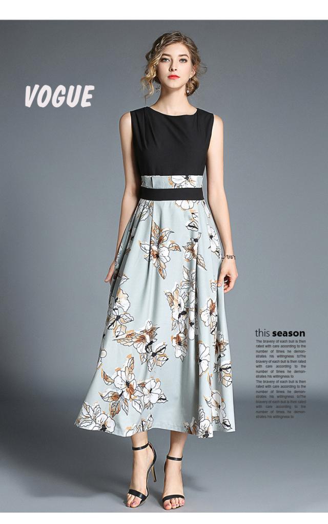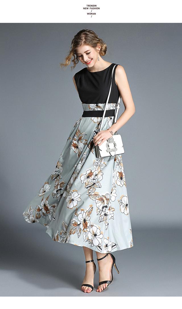 トップスはシンプルのノースリーブデザインで、スカートは大きな花柄プリントのワンピース。