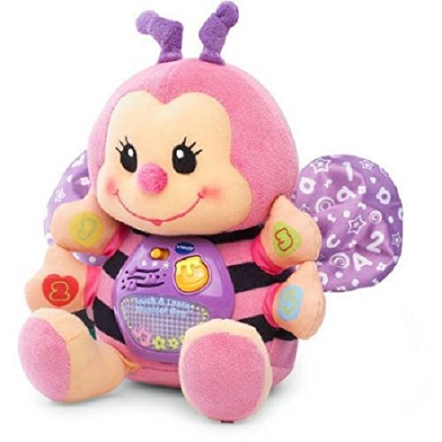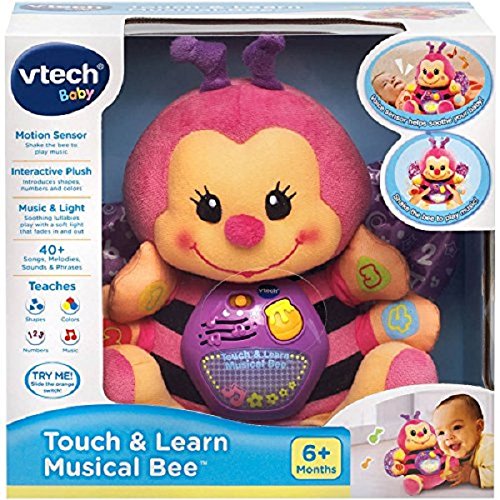 The VTech Touch and Learn Bee teaches shapes, colors, numbers and music. It features a cute and cuddly design. This VTech bee has four press buttons and plays music when shaken. It also includes a honey pot that young children can press to activate the soothing tunes. This learning toy has playful flashing lights that change to a soft glow in sleepy time mode.