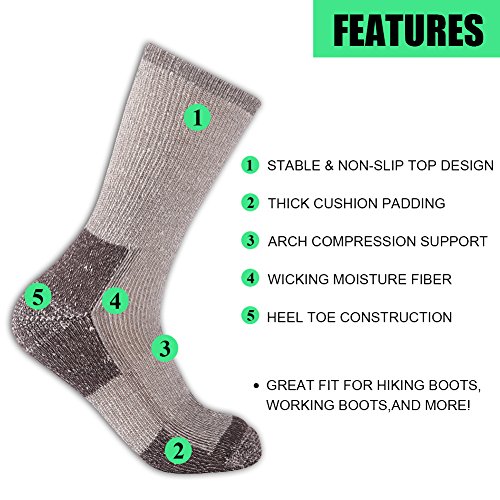 -. Feature : SIZE: These wool socks come in two sizes to choose from: US Unisex Size: 6-8.5 and US Unisex Size: 9-13. A perfect gift choice for family and friends! / SOFT & COMFORTABLE: Perfect Hiking Socks made of soft and comfortable material to protect your feet from chafing due to hiking boots. These Wool Hiking Socks for Women & Men fit comfortably for any footwear and always stay in place without bunching up or sliding down during movement. / BREATHABLE & WARM: KitNSox Wool Socks with medium thickness can keep your feet warm and breathable at the same time, thereby these wool socks are extremely suitable for Athletic Sports such as Hiking, Camping, Trekking, Walking and Climbing. / MOISTURE WICKING & ODOR RESISTANCE: Wool is the most breathable fabric that absorbs moisture better than other fibers, which helps keep your feet dry and cool and prevent odor and fungi. / REINFORCED TOE & HEEL: Our Wool Hiking Socks are designed with full cushion, seamless toe closure, and reinforced toes and heels, which provides extra strength to help reduce foot fatigue.