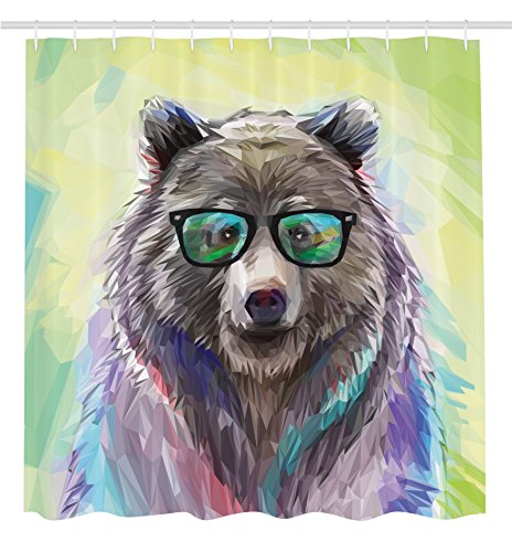 Funny Animal Shower Curtain by Ambesonne, Cool Low Poly Hipster Bear Wild Animal Portrait Spectacled Bear with Fluffy Colorful Fancy Decor Cute Charming Bathroom, Lime Green Blue Gray Pink Purple