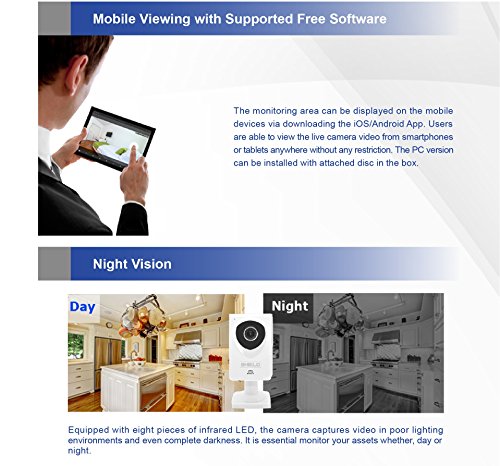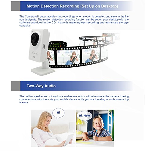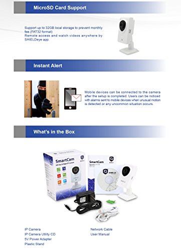 -. Feature : Plug and Play (PnP) supports for the "SHIELDeye" mobile App utilizing QR code. Supports local storage SD Card up to 32 GB (Not Supplied). / 1280 x 720p Display Resolution. H.264 compression for smoother video & smaller files. / IR lights for night vision up to 8 meters, Day & Night surveillance IP camera, Motion Detection alarm via APP notification, E-Mail and FTP. Built-in Mic & Speaker and Audio Jacks for External Mic & Speakers. / Compatible with Windows PC and Apple Mac Web Browsers (IE, Firefox and Safari) as well as iOS and Android mobile devices. / Interacting with your friends, family and pets by 2 Way audio immediately. Suitable for a baby camera, pet monitor, security camera, network camera, wifi / wireless IP camera and etc.