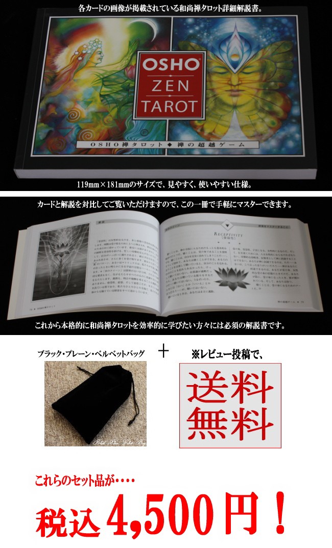 | 和尚禅タロット・セットの内容は、「和尚禅タロット(カード枚数79枚+ミニ解説書)」「和尚禅タロット詳細日本語解説書」「黒無地のベルベットバッグ」となります。 | |