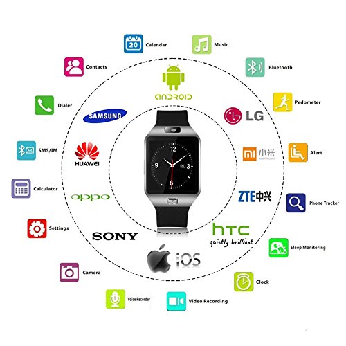 -. Feature : Phone Function: Make phone call directly from the smart watch, including answering and dial-up. SIM slot,support make calls by Bluetooth Mode or Smartwatch Mode / Ant-lost Function: Seek mobile phone, Tow-way anti lost; Sync Function: QQ, Wechat, Twitter, Facebook. HD display: High sensitive capacitive touch screen / Multi Functions: Passometer, Sleep Tracker, Message Reminder, Call Reminder, Answer Call, Dial Call, Remote Control, Push Message, Altitude Meter / Compatibility: All Android Phone and Android Tablet PC. Android Mobile Phone: Samsung, HTC, Sony, LG, HUAWEI, ZTE, OPPO, XIAOMI, and so on. iOS Mobile Phone only use by bluetooth: iPhone 6, iPhone 6 plus, iPhone 5, iPhone 5s , iPhone 4, iPhone 4s (This APP can' t be installed by iOS, Apple system can' t sync SMS and Bluetooth push information, but other functions can be used by iPhone); Android Tablet PC: Samsung, Nexus, Onda, Newsmy, and so on / Note: This watch is Bluetooth 3.0. All functions support android 4.3 and up smart phones. But for iphone, not it just support answer & call, phone book, music play, camera, clock, pedometer, phone anti-lost alert. Still not support SMS, Radio, remote camera control, sleep monitoring, etc
