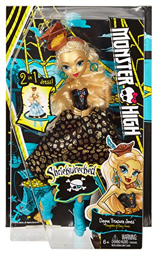 -. Binding : Toy -. Brand : Monster High -. EAN : 0887961365535 -. Feature : Based on Monster High Shriek Wrecked, this Monster High doll is an absolute treasure / Dayna Treasura Jones doll, daughter of pirate Davy Jones, is decked out in a nautical-themed outfit that makes a splash with lots of hidden details / Pull her skirt to transform the look from a blue satiny skirt P.R.Inted with treasure maps to a black skirt with golden foil P.R.Int / Slide her collar necklace around to reveal a jeweled piece / And pull off the wedge heels on her blue pirate boots to reveal golden coins -. IsAdultProduct : 0 -. Label : Mattel -. Manufacturer : Mattel -. Model : DTV93 -. MPN : DTV93 -. PackageQuantity : 1 -. PartNumber : DTV93 -. ProductGroup : Toy -. ProductTypeName : TOYS_AND_GAMES -. Publisher : Mattel -. ReleaseDate : 2016-04-13 -. Studio : Mattel -. Title : Monster High Shriekwrecked Dayna Treasura Jones Doll -. UPC : 887961365535 -. Warranty : 1 year warranty against manufacturer defects