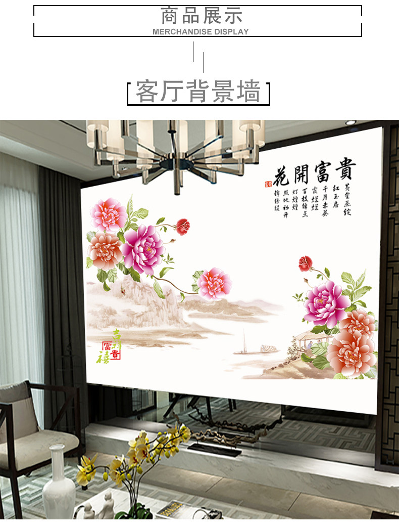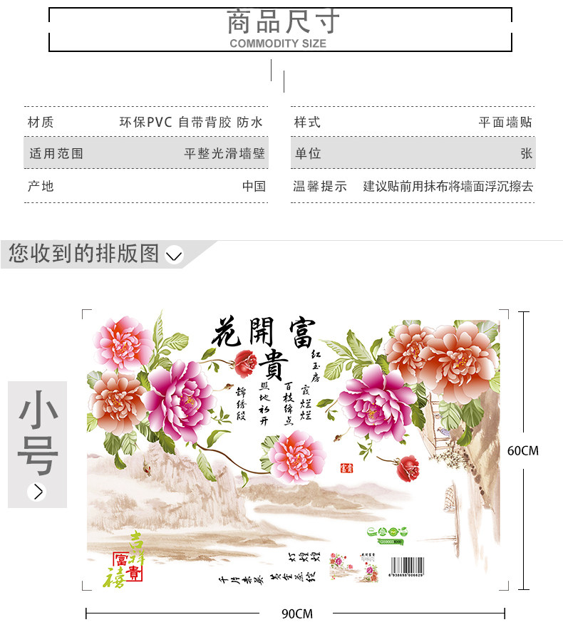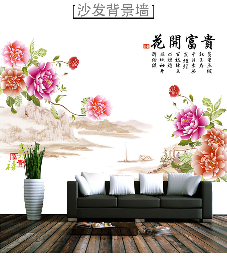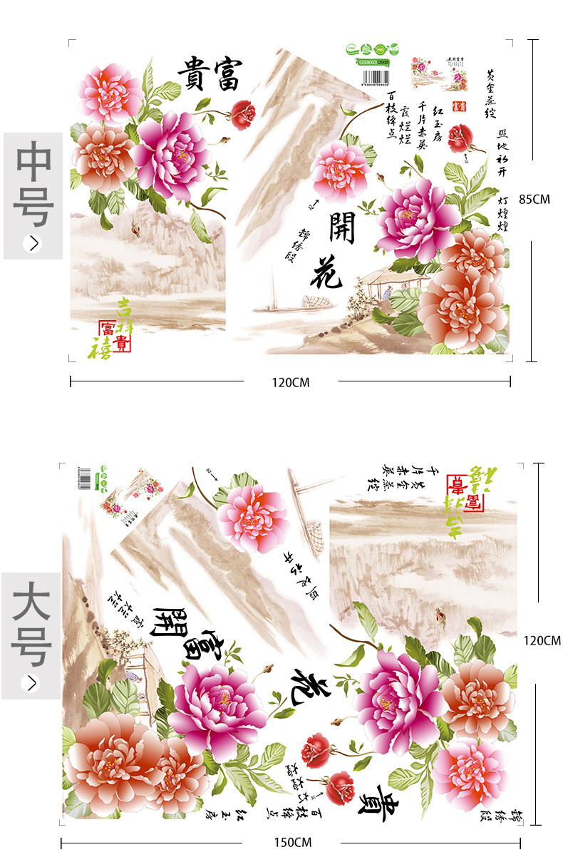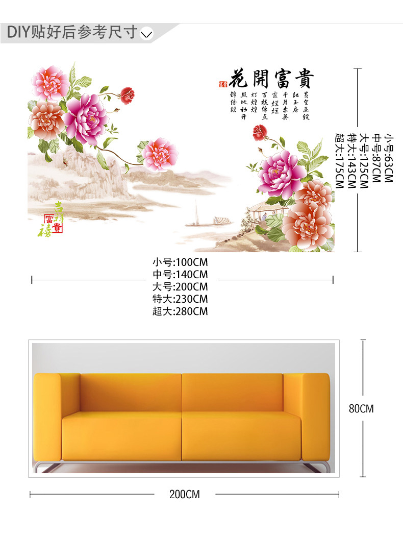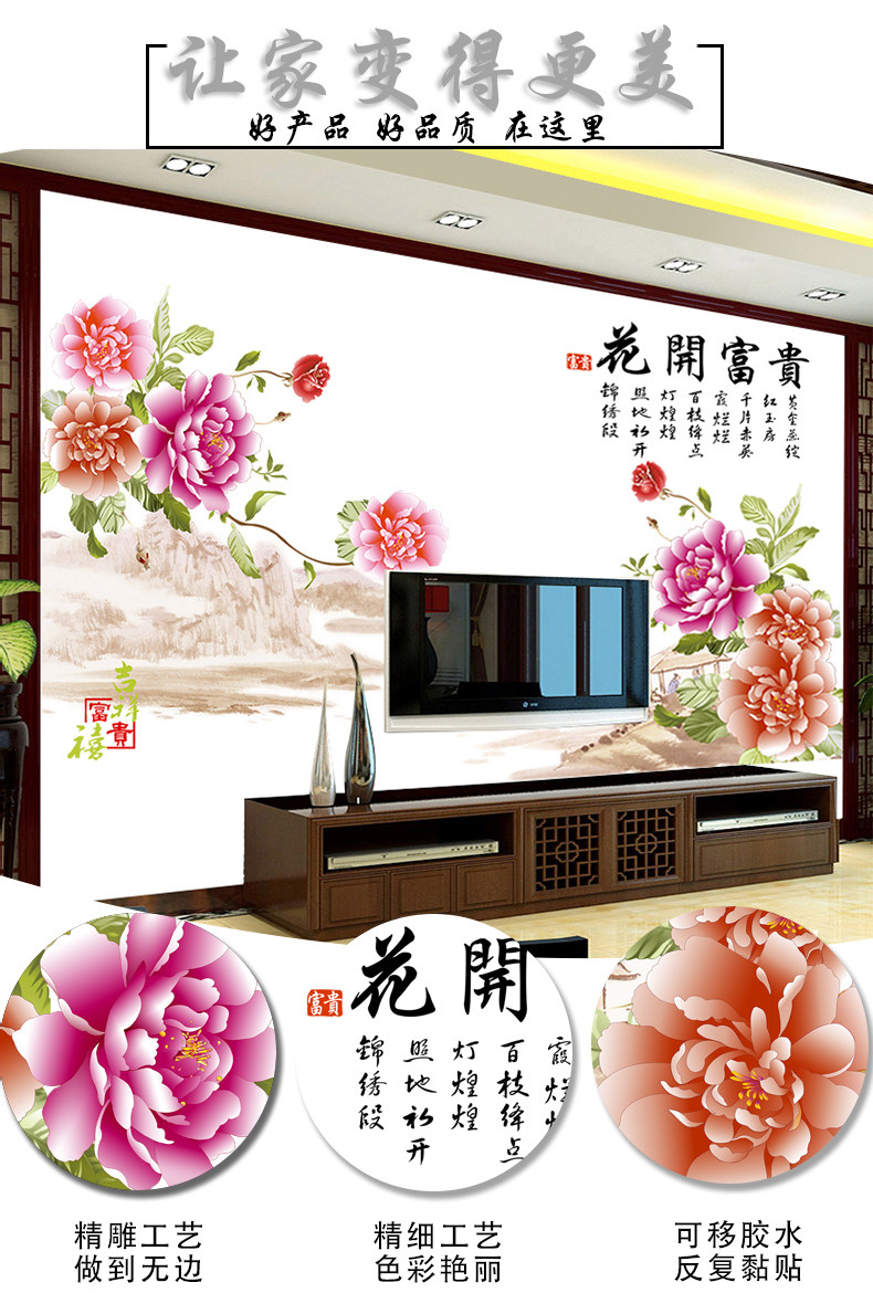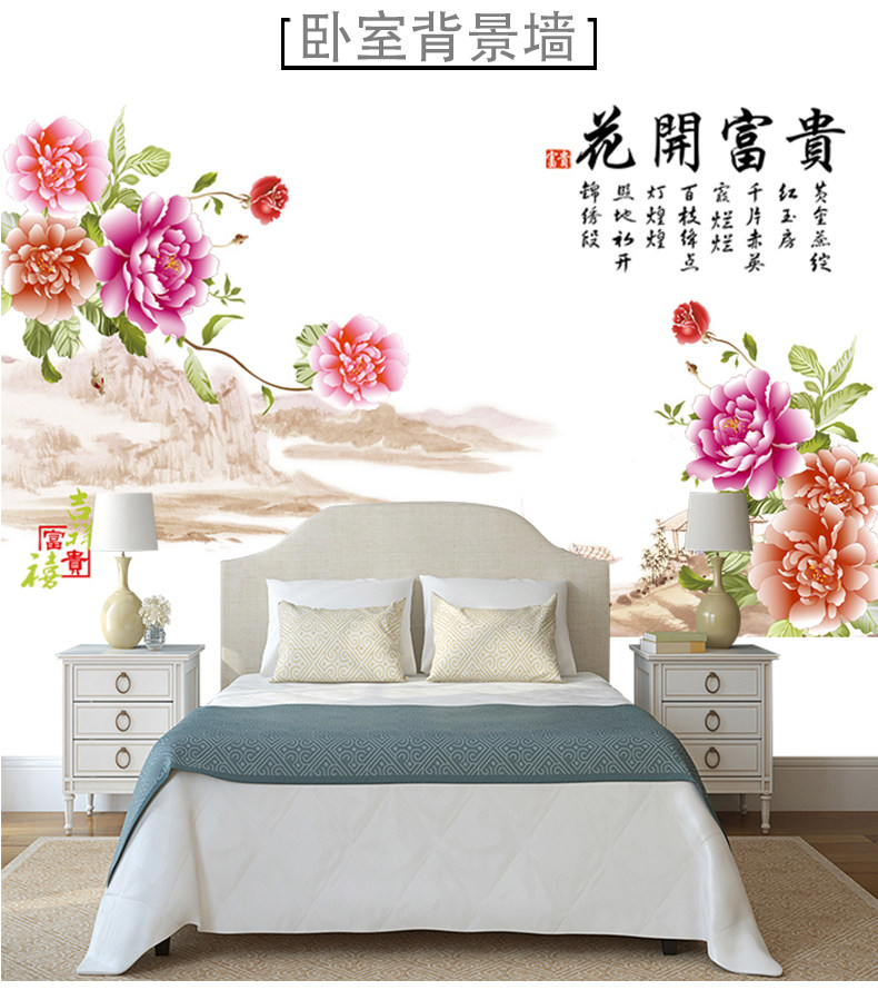 中国风家和牡丹花墙贴 卧室客厅背景装饰超大贴画 环保可移除贴纸