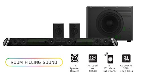 Get ready to be blown away by 400 Watts of Room-Filling Sound, powered by 11 perfectly tuned speaker drivers that deliver up to 104dB of crystal clear sound, and an 8" Wireless Subwoofer that produces ground shaking bass that will rumble as low as 35Hz.