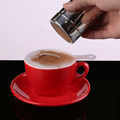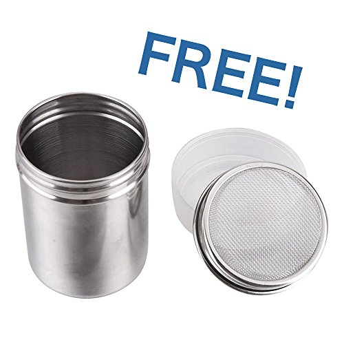 FREE HIGH QUALITY POWDER SHAKER: Seamless & sleek stainless steel design, with a sealed plastic cap, moistureproof. Diam*High: 2.3 * 3.3 inch, lightweight and durable. Threaded type lid is more convenient to open. Stainless steel Fine mesh is ideal use for sprinkling cocoa powder. Also very perfect for salt, sugar, and pepper in the kitchen.