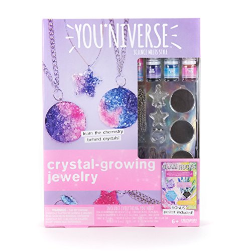 -. Feature : Science meets style: create 6 trendy pieces of jewelry that are created through the process of crystallization! / Steam: learn the chemistry behind crystals and make colorful, artistic eye-catching jewelry creations! / Science in action: seeing is believing. Foster an interest in science with hands-on experimentation and observation / Crystal growing jewelry includes: alum powder, 5 necklace bezels, a ring bezel, 3 color dye droppers, 3 chains, 2 skeins of elastic cording, wax cotton cording, glue, paint brush, poster, instructions / Age range: 6 years & up