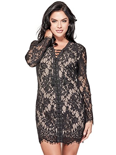 A long-sleeve lace dress featuring a self-tie lace-up design and sheath silhouette.