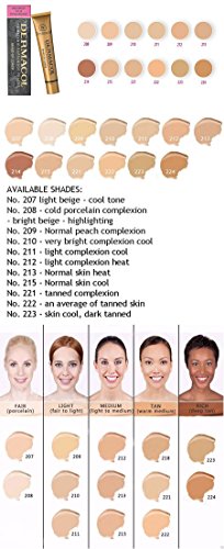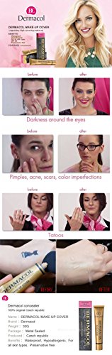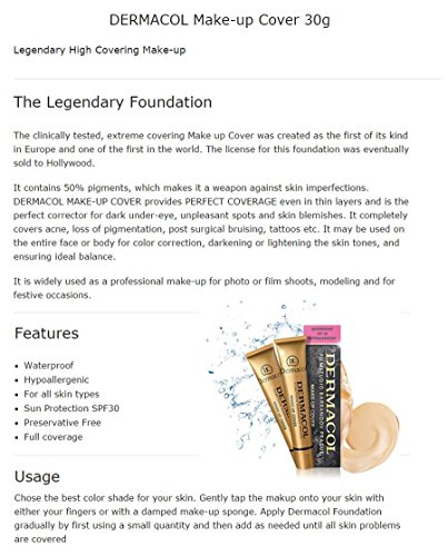 -. Feature : DERMACOL MAKE-UP COVER provides PERFECT COVERAGE even in thin layers and is the perfect corrector for dark under-eye, unpleasant spots and skin blemishes. It completely covers acne, loss of pigmentation, post surgical bruising, tattoos etc. It may be used on the entire face or body for color correction, darkening or lightening the skin tones, and ensuring ideal balance. / Legendary high covering make-up BENEFITS : Waterproof Hypoallergenic For all skin types SPF 30 Preservative free / COVERAGE : Full (extreme) The clinically tested, extreme covering Make up Cover was created as the first of its kind in Europe and one of the first in the world. The license for this foundation was eventually sold to Hollywood. It contains 50% pigments, which makes it a weapon against skin imperfections. / Dermacol Make-up Cover - Acne Get rid of acne! Dermacol Make-up Cover - Tattoo Are you preparing for a meeting and need to hide your tattoo? Don't be nervous and use Make-up Cover. Dermacol Make-up Cover - Dark circles under the eyes Dark circles under the eyes, loss of pigmentations and other skin problems...forget it and use Make-up Cover. / How to use Chose the best color shade for your skin. Gently tap the makup onto your skin with either your fingers or with a damped make-up sponge. Apply Dermacol Foundation gradually by first using a small quantity and then add as needed until all skin problems are covered.
