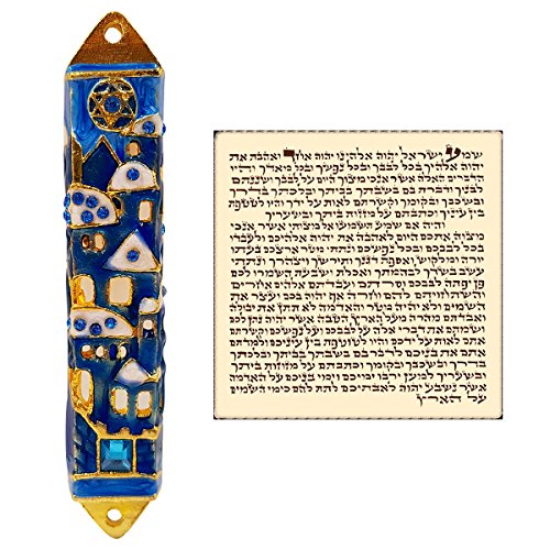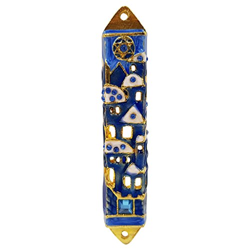 - Jerusalem Mezuzah Case with Scroll For Door Blue Enamel & Crystals Star Of David Israel Judaica Gift 8 cm
