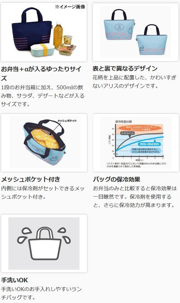 | 1段のお弁当箱に加え、500mlの飲み物、サラダ、デザートなどが入るサイズの保冷バッグです。内側には保冷剤がセットできるメッシュポケット付き。手洗いできるので、いつも清潔にお使いいただけます♪ |