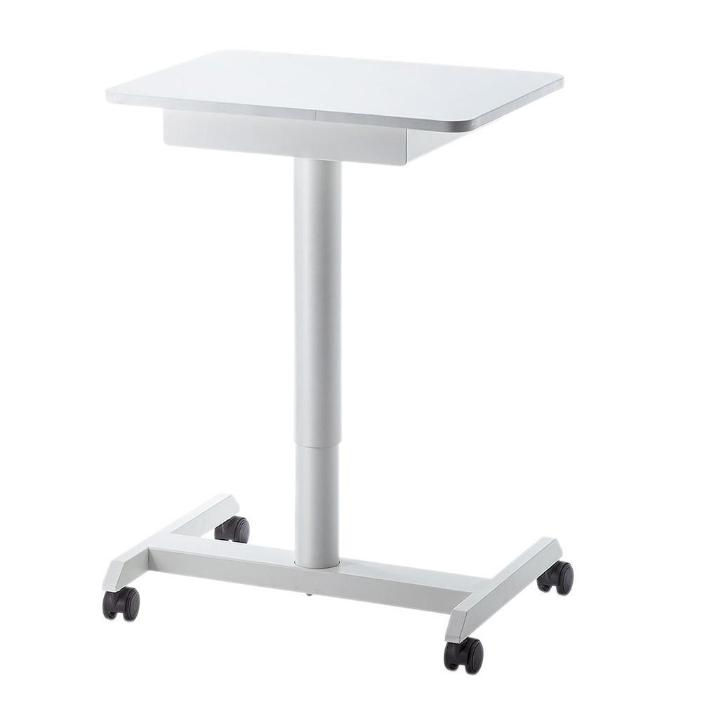 | 移動しやすいウレタン製キャスターを装備したデスク。A4用紙を収納できるトレーや、カバンなどを引っ掛けることができるフックが付いています。 |