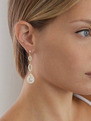 Mariell's lavish Cubic Zirconia earrings for brides, weddings, proms, pageants, homecomings or bridesmaids feature breathtaking inlaid micro pave CZ's. These slender 14 Karat Gold plated earrings have to be seen in person to fully appreciate their elegant understated brilliance and sparkle. Adorn your special occasion dress with these best selling dangle earrings for a dramatic finishing touch. With their unique and intricate pear-shaped silhouette, all eyes will be on you as you make your grand entrance in these breathtaking CZ. Vintage heirloom styling seamlessly blends with a slender modern design for the perfect gold jewelry for any occasion. With a lifetime quality guarantee, we promise you'll love these top-selling beauties for years to come!Feature