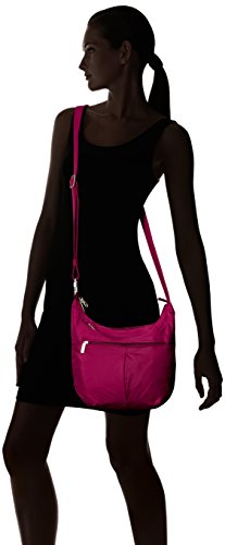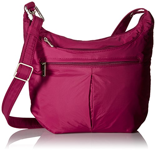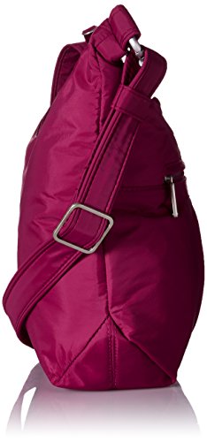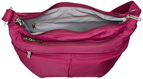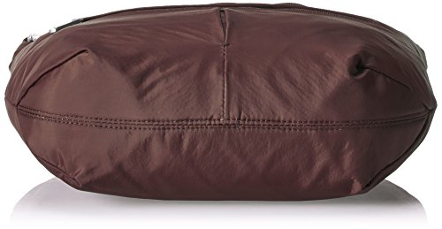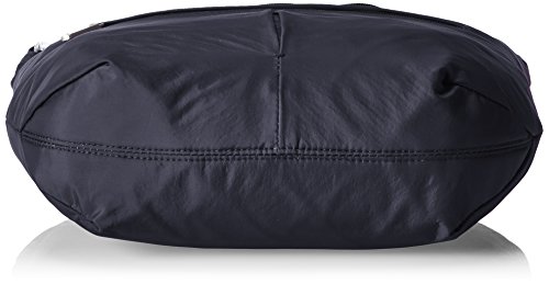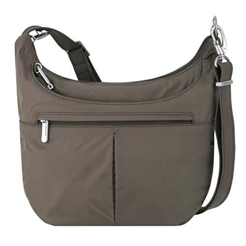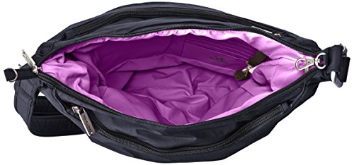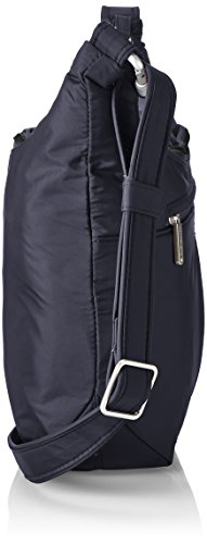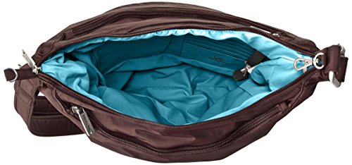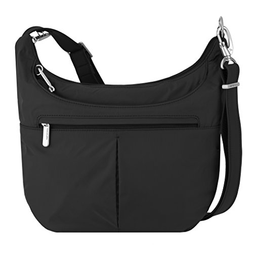 [Description] Roomy main compartment has organizer with RFID blocking card_ passport slots_ wall pocket and full length zipper pocket. Locking main compartment with RFID blocking card and passport slots Slash-proof construction Adjustable_ cut-proof strap attaches to post or chair Two front zip pockets and rear slash pocket