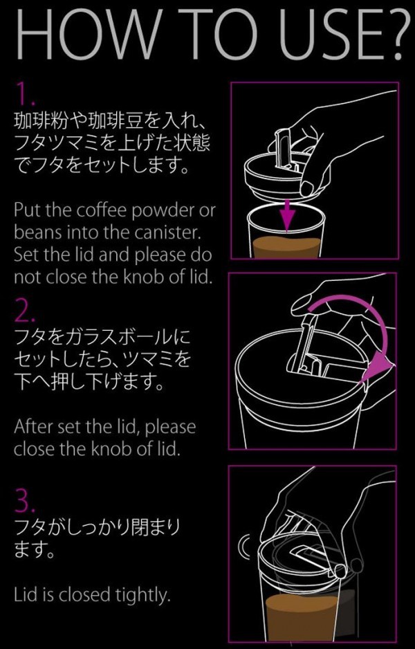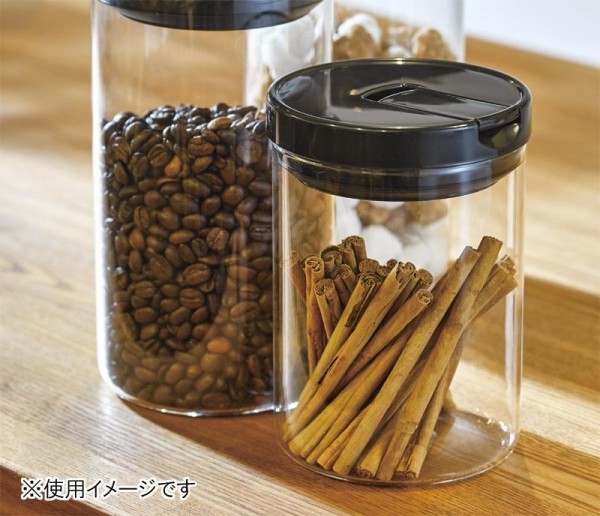 | 珈琲粉や乾物入れなどに使用できます。シリコーン使用で、フタがしっかり閉まり湿気に強く、豆の酸化も防ぎます。フタツマミを上下に操作するだけで簡単に開閉ができます。 |