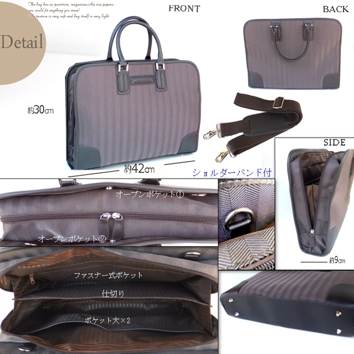 商品管理番号MT3948■カラーブラックブラウン■サイズ・容量◆SIZE:幅×高さ×奥行【BAG約42×30×9cm】◆仕様:オープンポケット×2 内側=ポケット大×2、ファスナー付ポケット×1 中央に仕切り有 ショルダー付規格フェイクレザー・ポリエステル