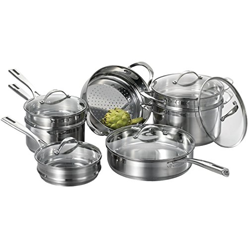 -. Feature : 12-Piece set consists of: two 9-1/2-inch lids, 9-1/2-inch steamer, 2.9-quart saute pan, 6.2quartt stock pot, 11-inch 4-1/2-quart deep fry pan with lid, 1.9-quart sauce pan, 2.3-quart sauce pan, 3.2-quart sauce pan / Constructed from extremely durable stainless steel, oven save up to 500 F ( 260 C ) / Impact-bonded base that provides superior heat distribution and even cooking / Exclusive riveted stainless steel handle design which provides a secure grip / Glass lids that allow you to keep an eye on your food without letting moisture escape
