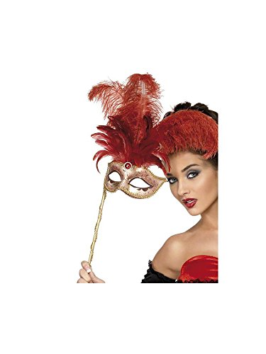 -. Brand : Smiffy's -. Department : womens -. Feature : Add a touch of mystery to your outfit with this baroque style eyemask. / Comes complete with mask on deluxe gold baroque stick. / Red and gold design with beautiful gold trim, feather and jewel embellishment. / Red/Gold. / Great for aristocratic balls and masquerade parties. -. ProductGroup : Apparel -. ProductTypeName : ADULT_COSTUME -. Title : Smiffy's Women's Baroque Fantasy Mask