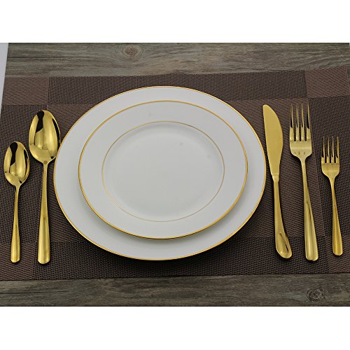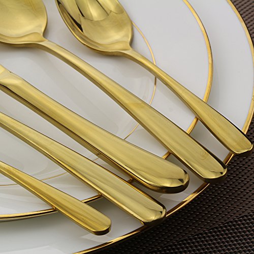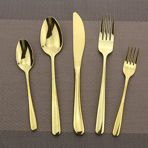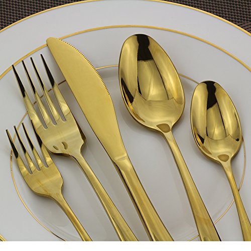 5-piece Gold Silverware Set including: ★ 1 x Dinner Spoon - 8.23inch, 2.19oz ★ 1 x Dinner Fork - 8.31inch,2.03oz ★ 1 x Table Knife - 9.09inch,3.15oz ★ 1 x Salad Fork - 5.98inch,1.03oz ★ 1 x Teaspoon - 6.3inch,1.23oz Note: Every pcs wrapped in a PVC bag, then packed in a Nice GiftBox. This 18/10 stainless steel gold cutlery set is wildly welcome by family dailyuse, wedding gift and friends gathing. Guarantee: If you are not 100% satisfied with any reason, Please "Contact Seller" directly, seller aims to provide hassle-free service and promisereplies all emails in 24 hours. No hassles, no delays, and no questions asked!