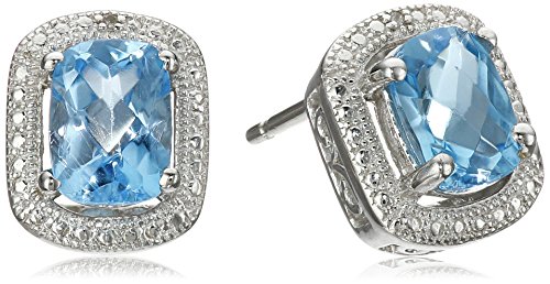Two-piece sterling silver pendant necklace and stud earrings set each featuring cushion-cut blue topaz in four-prong setting with diamond-encrusted halo