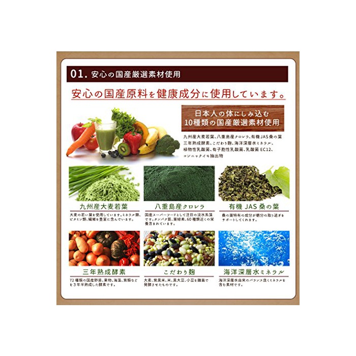 10종류의 국산 엄선 소재 사용 .국산 보리 새잎,야에야마산 클로렐라,유기JAS상의 엽,3년 숙성 효소,(엄선)고집국,해어 심층수 미네랄