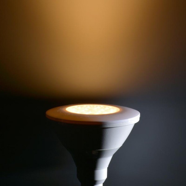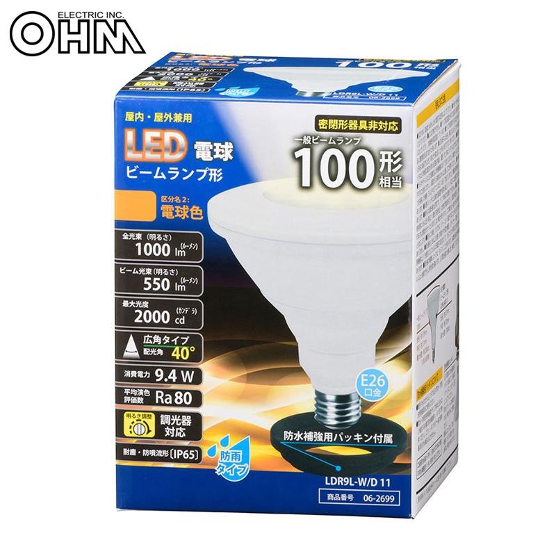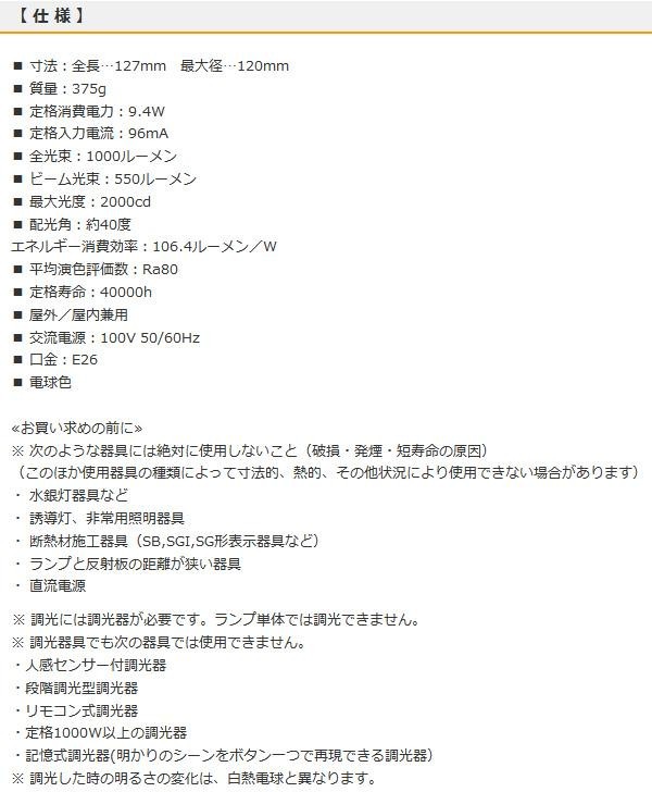 ビームランプ100形相当の明るさ。屋外・屋内兼用で光色は電球色です。調光器にも対応します。
