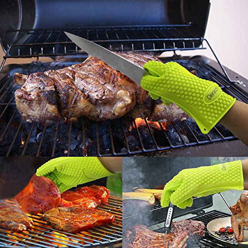 - 100% FDA Approved and BPA Free High grade Silicone BBQ gloves -You are free from any risks to place and remove food in boiling water; Handle juicy meats, pull pork and chicken with ease and comfort.
