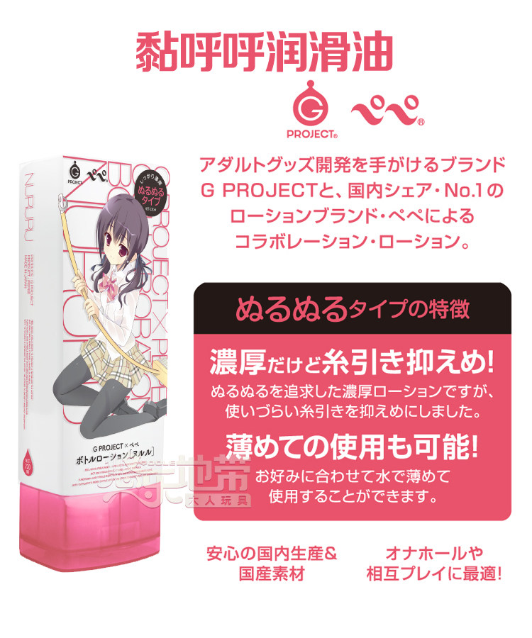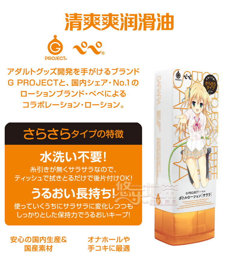G PROJECT和日本No.1的潤滑液品牌合作限量潤滑液。清爽的類型,不需要水洗!不會牽絲的清爽?,只是用衛生紙擦過後就能乾乾淨淨!滋潤長效型!不管怎麼使用都能清清爽爽並將水潤緊緊鎖住!最適合用在自慰器和手淫時!