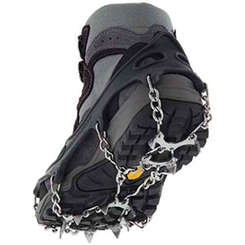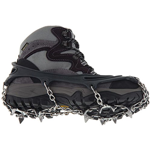 FEATURES of the Kahtoola MICROspikes Instant ice traction system you cad add to your winter footwear Packs small to fit in a backpack, jacket pocket, purse or handbag Provides traction and safe footing on slippery terrains including ice, snow, and wet trails No special straps or laces, so they can be put on in just a few seconds with no struggling Easily fit over most footwear, including your winter boots Spikes are made with heat treated 400 series stainless steel. Neat. Protected by Kahtoola's 2 year warranty SPECIFICATIONS of the Kahtoola MICROspikes 3/8" spike length (1 centimeter) 10 spikes per foot (X-Small) 12 spikes per foot (Small - X-Large) Spike Material: heat treated 400 series stainless steel Pack Sizes: 5" x 5 1/4" x 2 1/4" Weight per pair for Small: 12.2 oz Weight per pair for Medium: 13.6 oz Weight per pair for Large: 14.4 oz Weight per pair for X-Large: 15.6 ozFeature