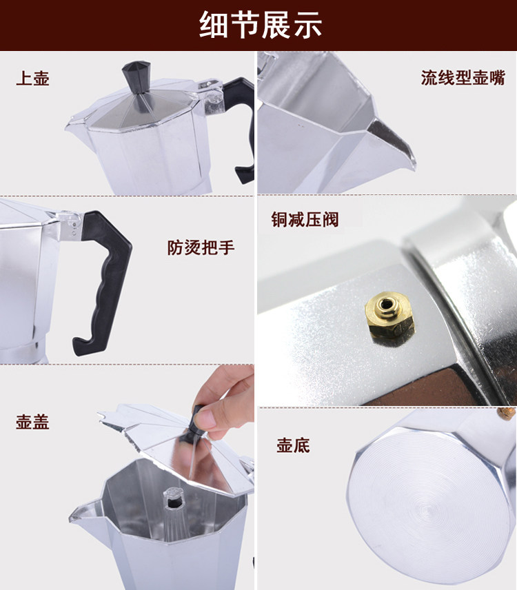 9 people Mocha pot brewed about 380ML coffee, suitable for 3 people to use