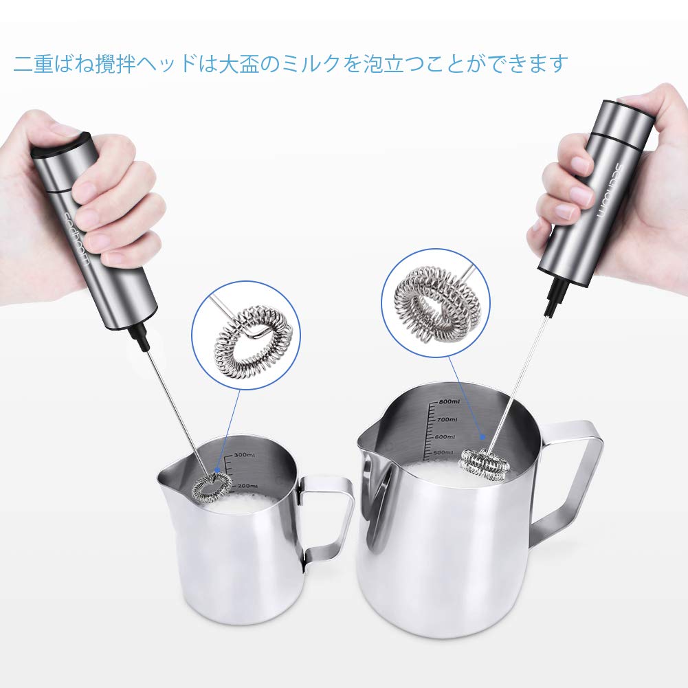 アップのデザイン:二重設計な攪拌ヘッドも付き、10秒間で発泡し、より強力で効率的に作業します、それにミルク泡を作成するだけでなく、カプチーノ、紅茶、卵、混合飲み物、冷たいとホットチョコレートにもできます。