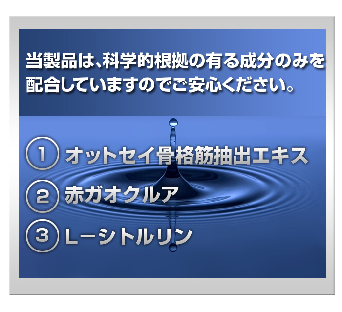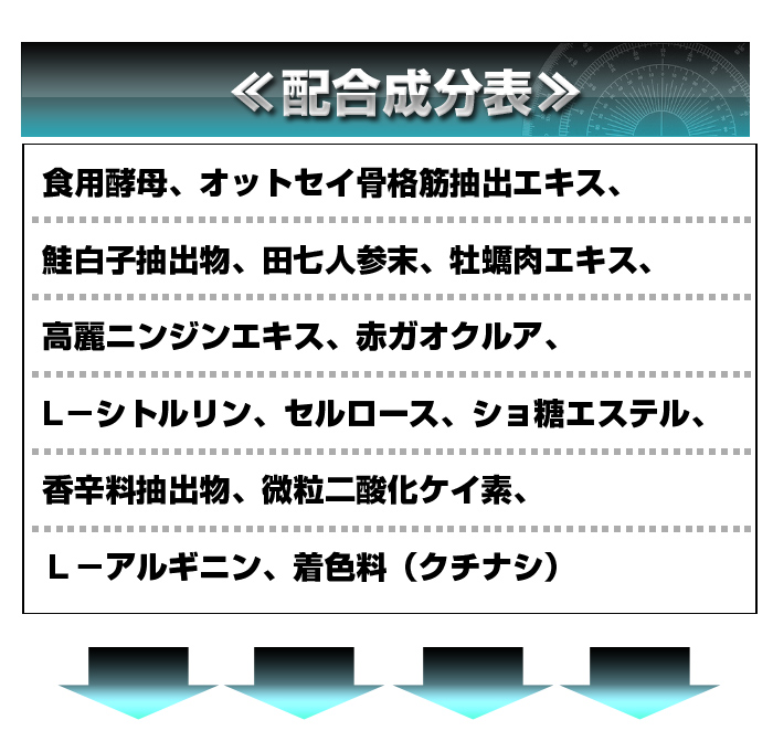 | Edible yeast, fur seals skeletal muscle extract, salmon milt extract, Panax ginseng powder, oyster meat extract, ginseng extract, red Gaokurua, L- citrulline, cellulose, sucrose esters, spice extracts, fine silicon dioxide, L- arginine, coloring (gardenia) |