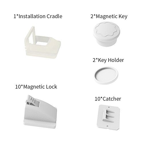 Product Specification: Type: Child Safety Magnetic Lock Material: ABS Quantity: 1 set (10 Locks 2 Key) Item Color: White Lock Size: 3.8*3.4*3.9cm / 1.5*1.3*1.5" Key Size: 3.6*3.6*2.3cm / 1.4*1.4*0.9" Net Weight: 0.2kg / 7oz
