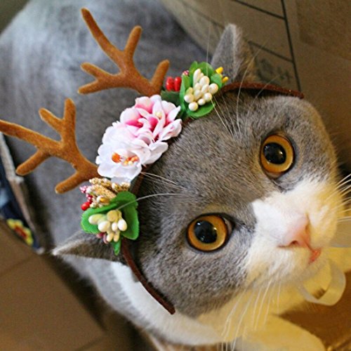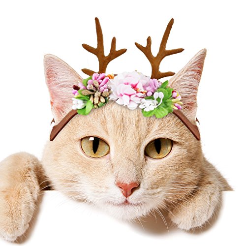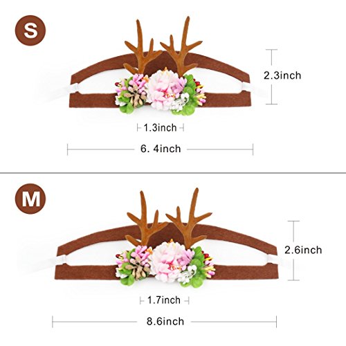 -. Feature : 【ADJUSTABLE SIZE 】--Size S: Fits length between the 2 ears less than 5.5 inche;SIZE M: Fits length between the 2 ears less than 7.9inches.Each strap length is 26cm/10.2inch.Please measure your pet'size before placing order. / 【SAFE & COMFORTABLE】-- Made of comfortable and durable cloth,it won't irritate pets skin. / 【EASY TO WEAR】--Easy to adjust to fit your pet with a tying strap,the straps can trap the ears, to prevent the hat fall. / 【FASHION &CUTE】--Antler style with flowers makes your pet adorable and special,it will brighten Christmas for you and your beloved pet. / 【PREFECT SUITABLE】--Suitable for dogs, cats and rabbits ect,perfect for daily wear, weekend parties, Halloween, Christmas,parades, photo shoot or play date.