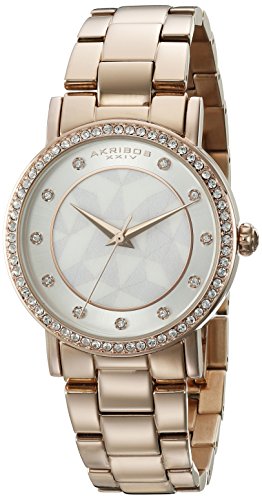 -. Binding : Watch -. Brand : Akribos XXIV -. Color : Rose/Gold/MOP/Mother-of-Pearl -. Department : womens -. EAN : 0848572072564 -. Feature : Radiant silver sunburst dial border with die cut center cutout and genuine white mother of pearl inset featuring three hand movement / Crystal hour markers with dauphine style rose gold tone hour and minute hands / Polished rose gold ion plated alloy case with genuine crystal bezel and polished rose gold ion plated stainless steel bracelet / Quartz movement with analog display / Water-resistant to 30 M (100 feet) -. Label : TWI Watches, LLC -. Manufacturer : TWI Watches, LLC -. Model : AK880RG -. MPN : AK880RG -. PartNumber : AK880RG -. ProductGroup : Watch -. ProductTypeName : WATCH -. Publisher : TWI Watches, LLC -. Studio : TWI Watches, LLC -. Title : Akribos XXIV Women's AK880RG Round Silver and White Dial Three Hand Quartz Bracelet Watch -. UPC : 848572072564