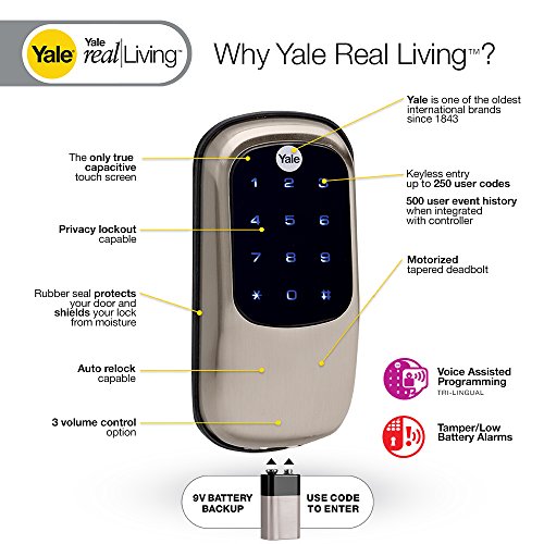 Freedom is placed at your fingertips with the new Yale Real Living. Liberate yourself with the next generation of home security locks from Yale, a trusted name. Enjoy the security and peace of mind knowing your doors are secured with Yale Real Living. This elegant key pad operated lock illuminates for convenient night time access. Take complete control of all users at each door by assigning customized codes (up to 25) for each door.Feature