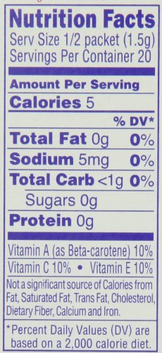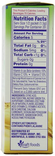 -. Feature : 5 Calories per Serving; 90% Fewer Calories than Leading Beverages; Caffeine free; Antioxidant Vitamins A, C & E; / Sugar Free; Low Sodium Gluten Free; Kosher / Pack of 12 (10 count boxes)