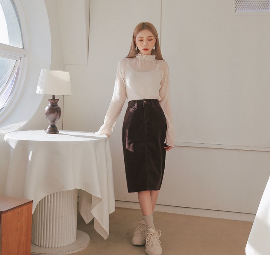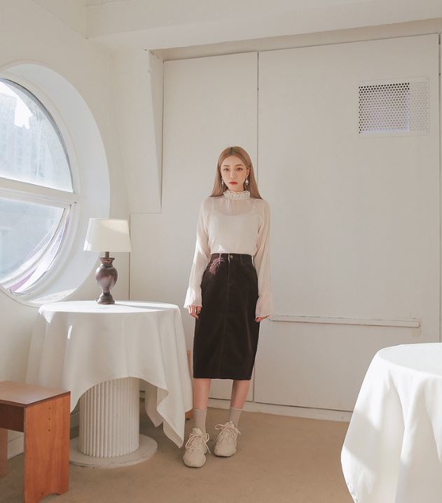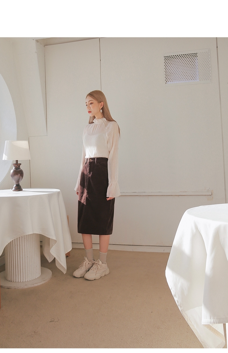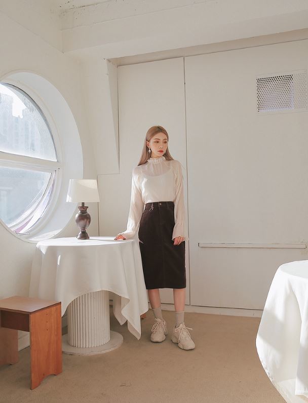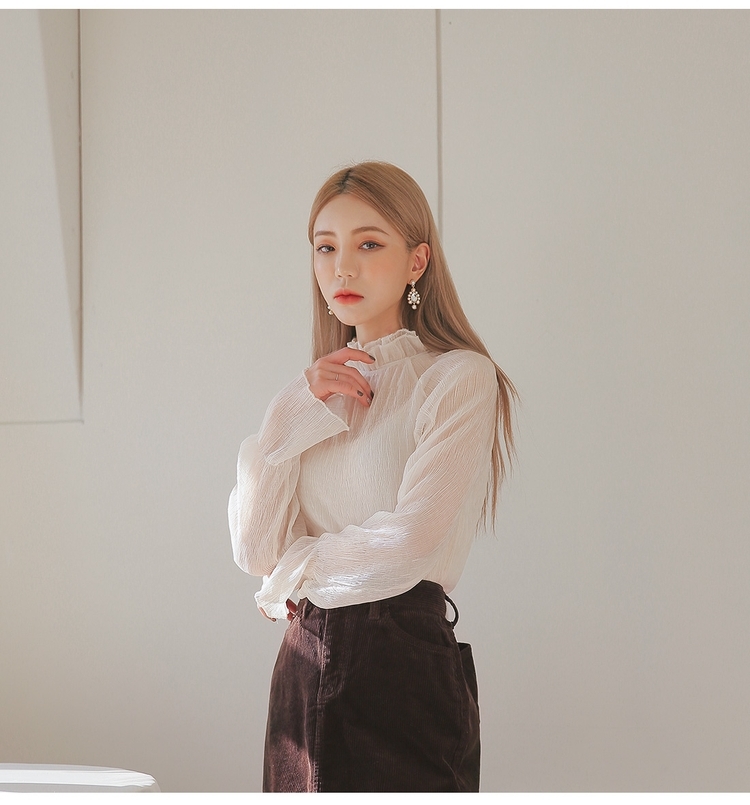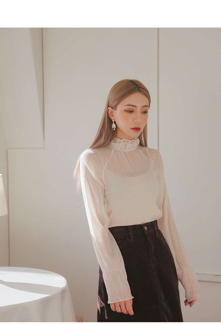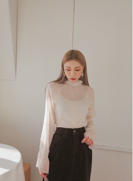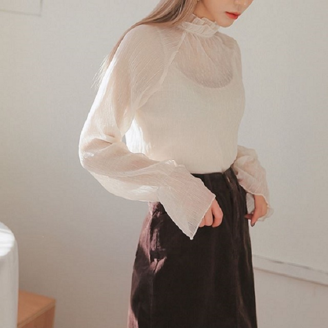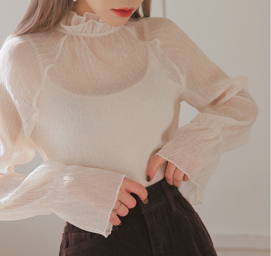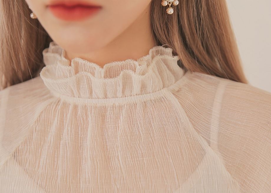 涼しげな透け感素材とハイネックのフリルが春を感じさせてくれるフェミニンなブラウス♪