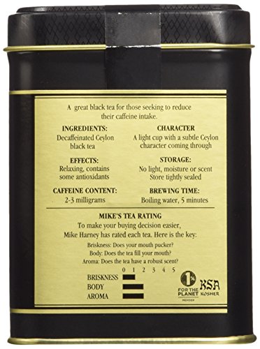 -. Binding : Misc. -. Brand : Harney & Sons -. Feature : Decaffeinated black tea with an intense lemon flavor / High Quality Black Tea with the Caffeine Removed -. Label : Harney & Sons -. Manufacturer : Harney & Sons -. ProductGroup : Grocery -. ProductTypeName : GROCERY -. Publisher : Harney & Sons -. Size : 4 oz. Tin -. Studio : Harney & Sons -. Title : Decaffeinated Ceylon Tea, Loose Tea in 4 Ounce Tin