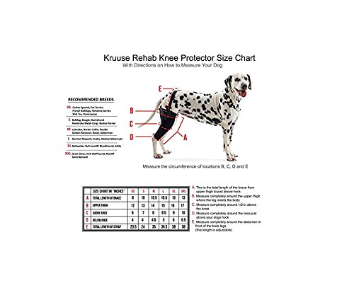 -. Feature : Joint protector for dogs. / Offers support for knees after sprains, strains and surgical procedures. / Also great for dogs with arthritis and ligament injuries. / Available for left and right legs. / Size (Length/Width - cm): XS- 8in/4.5in, S- 9.8in/5.2in, M- 10.4in/5.7in, L- 10.4in/6.1in, XL- 12.9in/6.8in, XXL- 12.9in/7.2in.