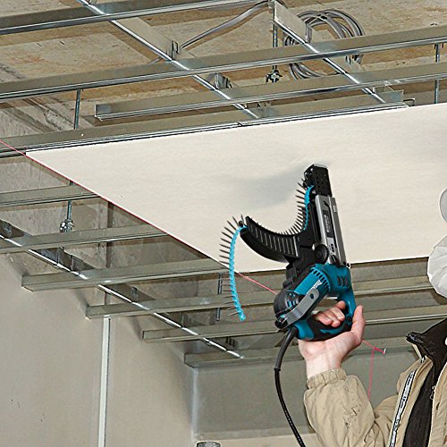 -. Feature : Zur schnellen Verarbeitung von gurtmagazinierten Schrauben / Ideal für Gipskartonplatten / Geräuschlos abschaltende Kupplung / Gummierte Aufsetzfläche verhindert das Abrutschen von glatten Oberflächen / Werkzeuglos (de)montierbarer Schraubvorsatz