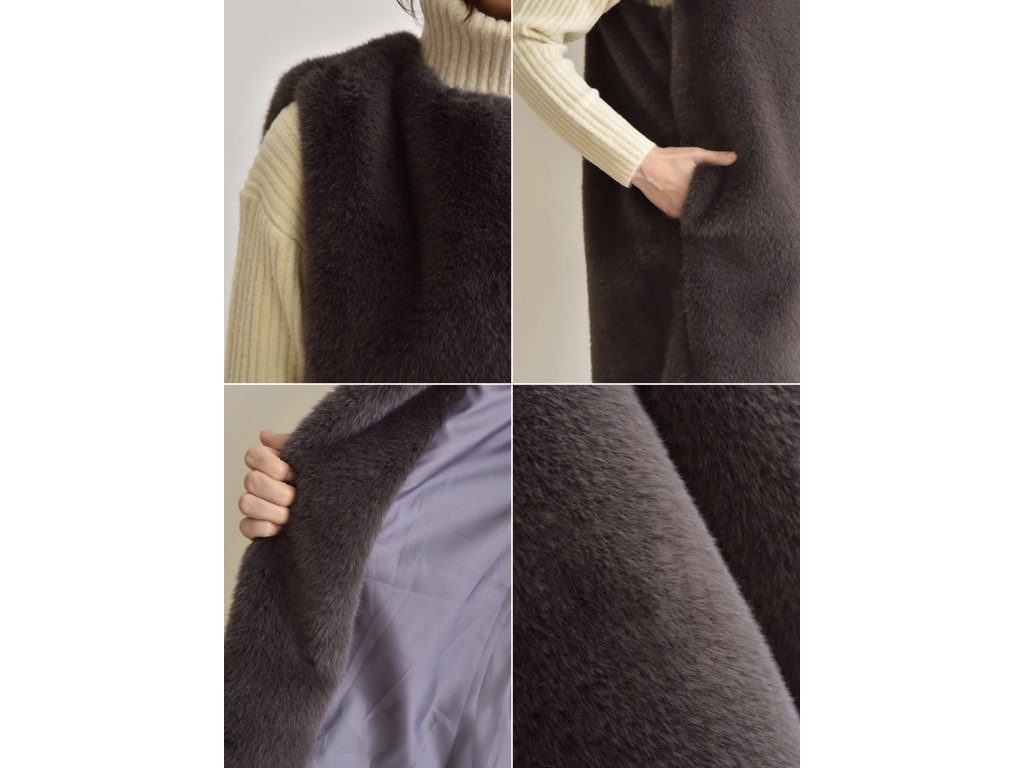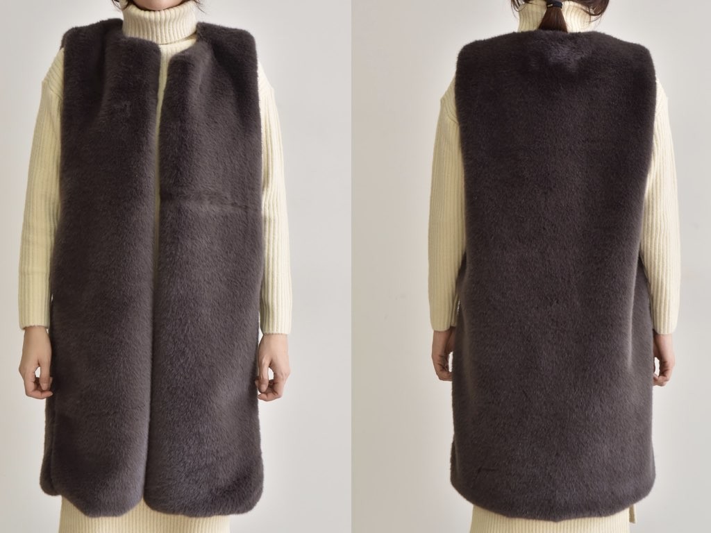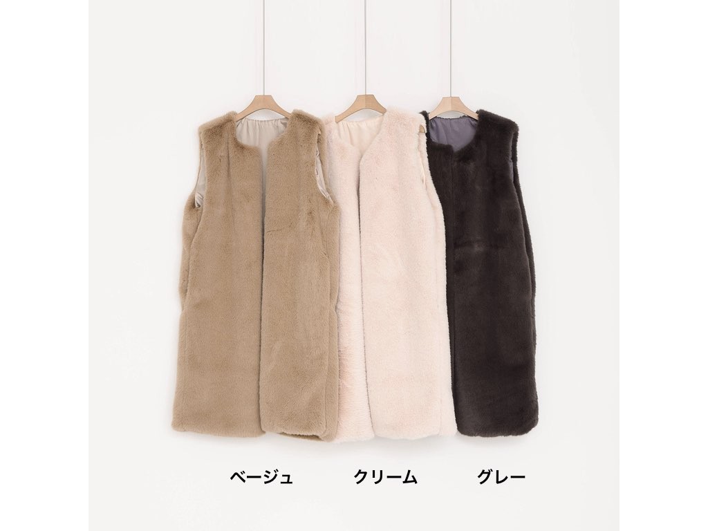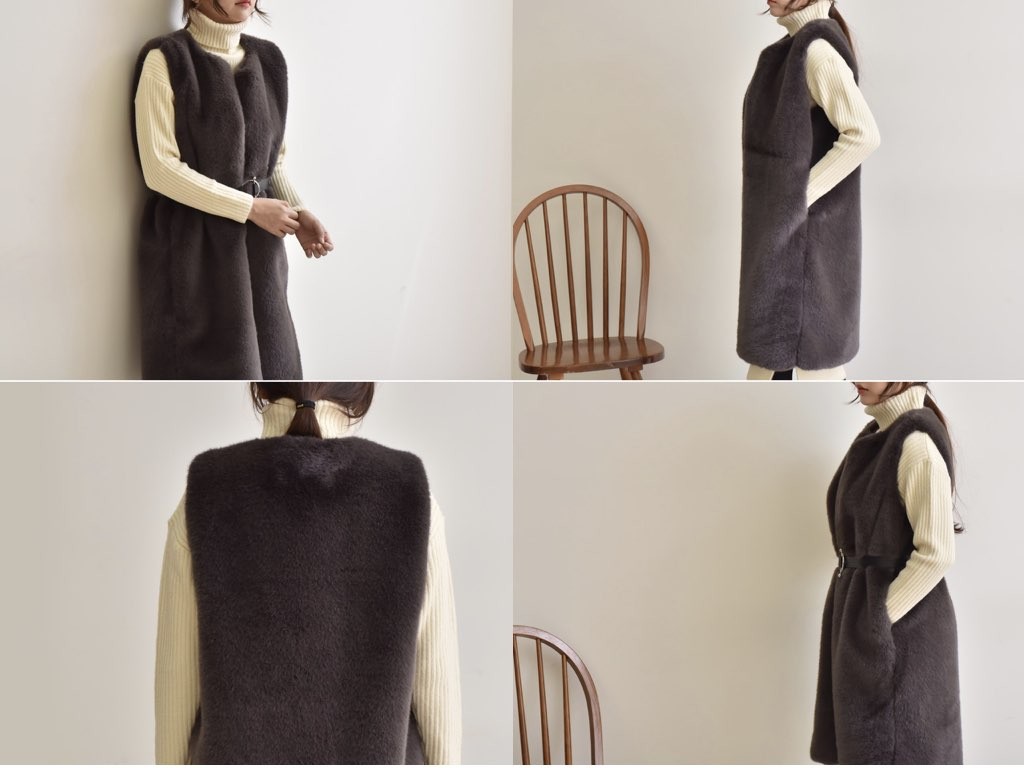 ファー ロングベストです。このアイテムを一枚プラスするだけで、季節感を取り入れつつ防寒対策もばっちり♪ですね。肌寒くなる秋冬は、防寒対策をしながらオシャレな着こなしにぴったりのアイテムです。1.基本情報色:3色展開(ベージュ/クリーム/グレー)サイズ:Free素材:アクリル製造国:Korea2.サイズ情報肩幅:39cm身幅(胸断面):52cmアームホール:21cm着丈(前):94cm(サイズは計る方法に応じて±2〜3cmの誤差があります。ご了承お願い致します)モデル着用サイズ:F※着用モデル(163cm、体重47kg、足のサイズ24.5cm)3.その他の情報厚み:厚い透け感:なし伸縮性:なし裏地:なし洗濯方法:ドライ(クリーニング)[注意事項]お取り寄せ商品は、海外より仕入れるため納品まで約10日前後いただきます。また店舗でも販売しており、在庫切れになる場合もございます。ご了承お願い致します。