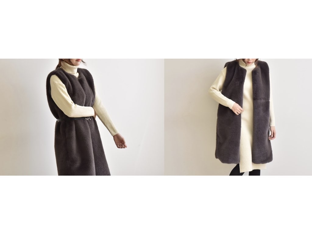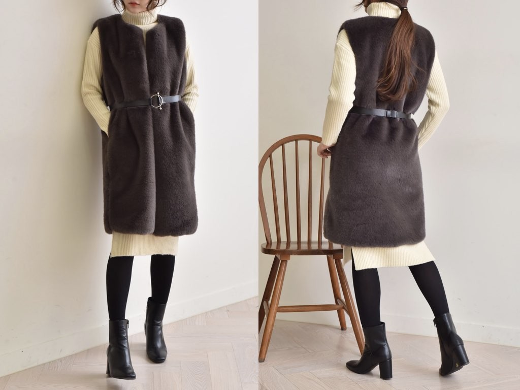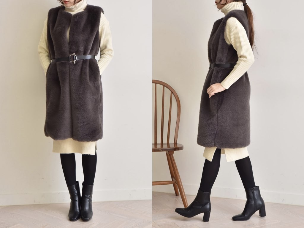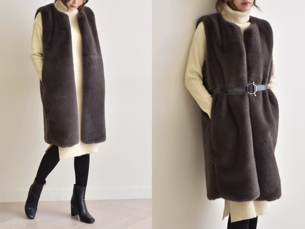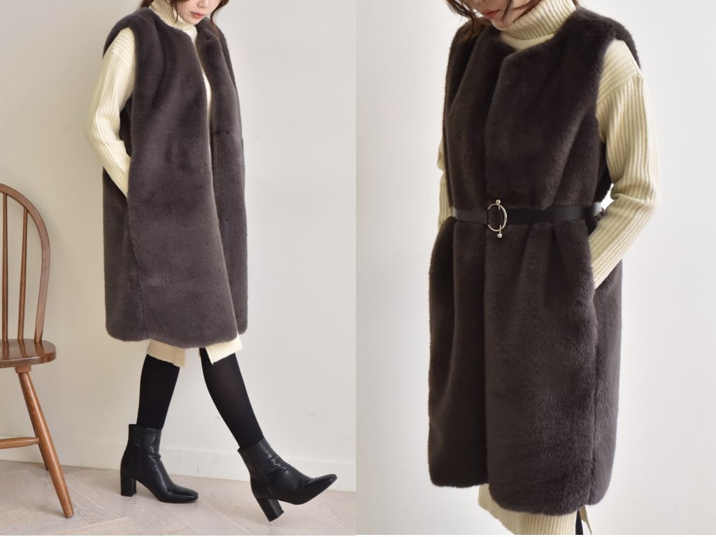 ファー ロングベストです。このアイテムを一枚プラスするだけで、季節感を取り入れつつ防寒対策もばっちり♪ですね。肌寒くなる秋冬は、防寒対策をしながらオシャレな着こなしにぴったりのアイテムです。1.基本情報色:3色展開(ベージュ/クリーム/グレー)サイズ:Free素材:アクリル製造国:Korea2.サイズ情報肩幅:39cm身幅(胸断面):52cmアームホール:21cm着丈(前):94cm(サイズは計る方法に応じて±2〜3cmの誤差があります。ご了承お願い致します)モデル着用サイズ:F※着用モデル(163cm、体重47kg、足のサイズ24.5cm)3.その他の情報厚み:厚い透け感:なし伸縮性:なし裏地:なし洗濯方法:ドライ(クリーニング)[注意事項]お取り寄せ商品は、海外より仕入れるため納品まで約10日前後いただきます。また店舗でも販売しており、在庫切れになる場合もございます。ご了承お願い致します。